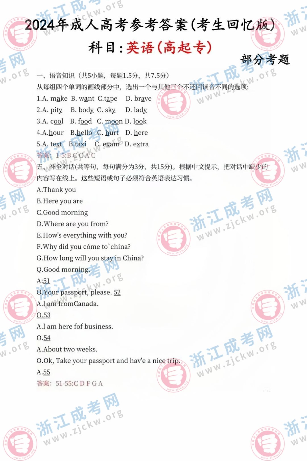 杭州成考網(wǎng)為廣大考生提供2024年成人高考全國統(tǒng)一考試(高起點(diǎn)英語)真題答案